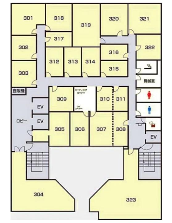 - 共用部に複合機設置のOAスペース完備 応接室・会議室・イベント室設備あり 給湯室・トイレ(男女別)共用部にあり 窓無し区画